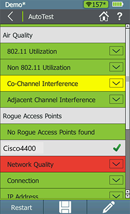 - AirCheck G2 offers a one-button AutoTest function that quickly provides a pass/fails indication of Wi-Fi network quality and identifies common problems
